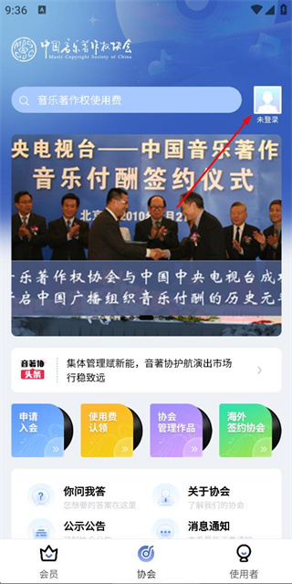 1、在协会首页点击右上角的头像区域,进入登录及入会页面。
