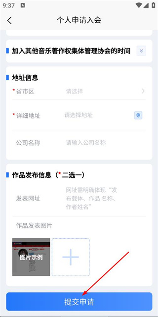 4、在个人申请入会页面填写所需信息后,点击提交申请完成入会申请操作。