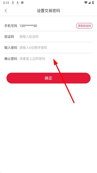4、在设置交易密码页面,获取并输入验证码,设置密码后确认,点击确定完成支付密码设置。