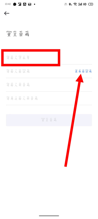 3、在重置密码页面,输入手机号,点击获取验证码。