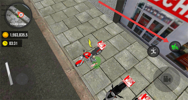 1、滑动陀螺仪操控角色移动,前往场景中的外卖摩托车位置,准备开启配送任务。