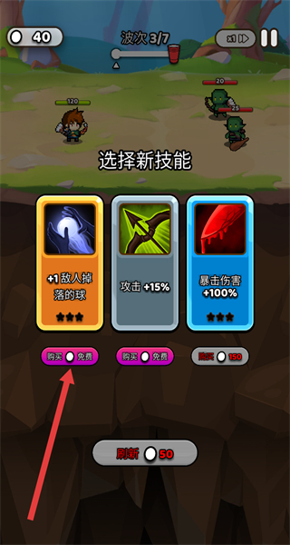 4、在技能选择界面,选择“+1敌人掉落的球”类技能,提升敌人被击倒后掉落的小球数量,进一步增加球的储备。