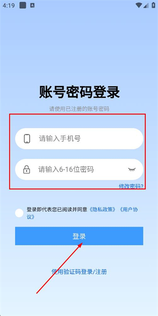 3、在登录页面填写手机号和密码,勾选协议后,点击登录完成账号登录操作。