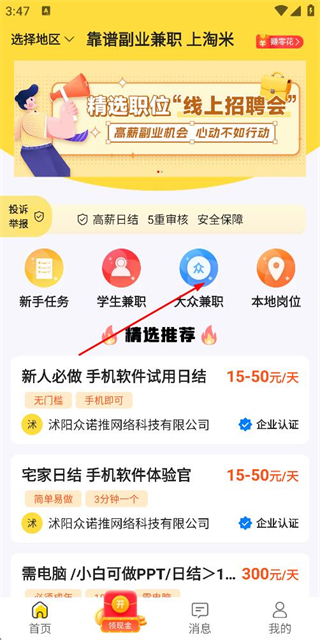 1、在兼职平台首页点击大众兼职选项,进入大众兼职岗位列表页面。