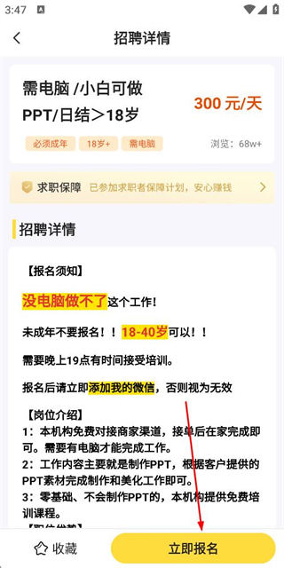3、在招聘详情页面确认岗位要求后,点击立即报名按钮参与该兼职岗位的报名。