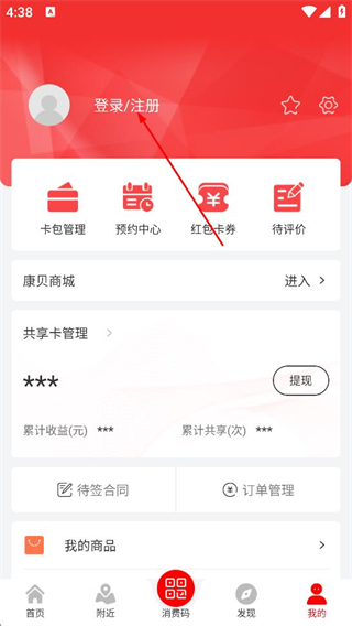 2、在个人中心页面,点击登录/注册按钮,进入登录界面。