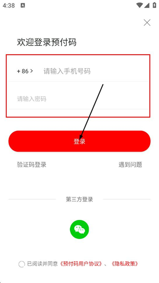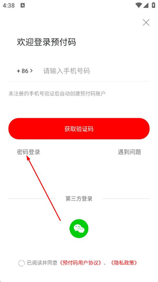 3、在欢迎登录预付码页面,点击密码登录选项,切换到密码登录界面。
