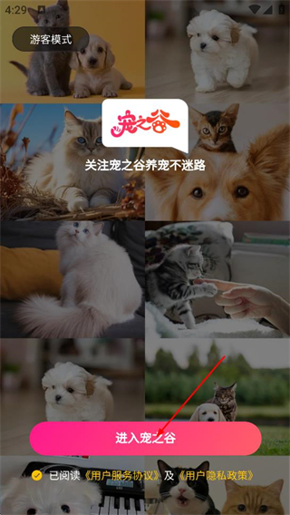 1、在宠之谷的启动页面,点击进入宠之谷,进行登录页面。