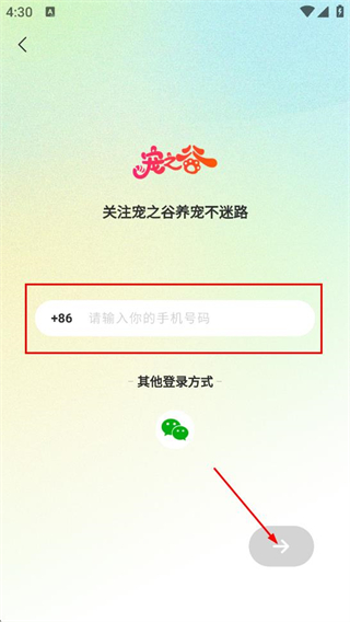 2、在宠之谷的登录页面,填写请输入你的手机号码后,点击继续。