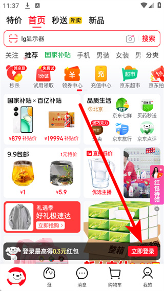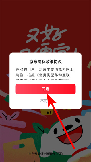 1、打开京东搬家,在弹出的弹窗中点击同意,进入京东首页。
