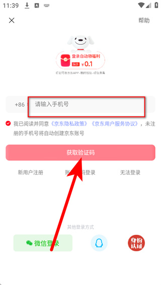 3、在登录界面的手机号框中填写手机号,勾选相关协议后,点击获取验证码。