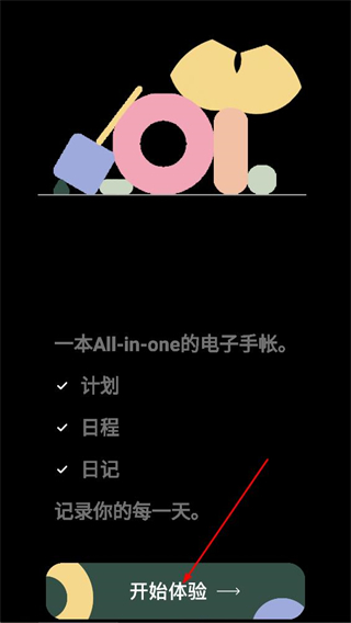1、在电子手帐的启动页面,点击开始体验按钮,进入应用。