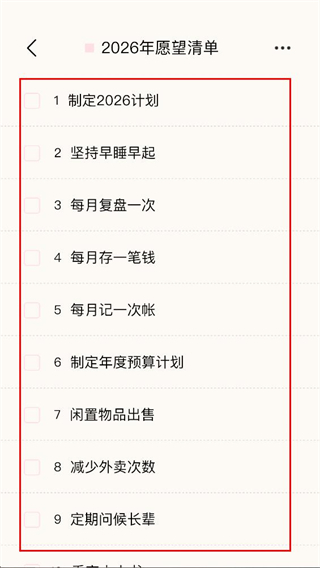 4、在2026年愿望清单详情页,我们可勾选对应事项的完成记录。