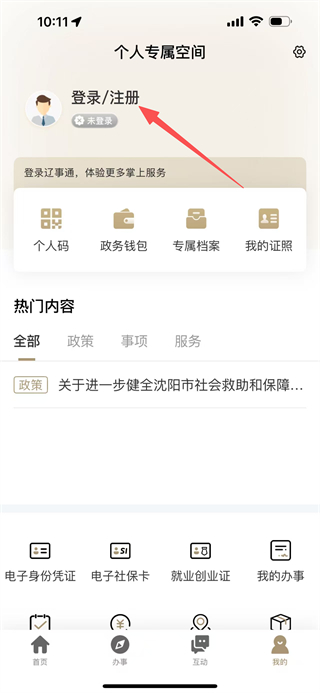 1、在辽宁通首页,点击底部的我的选项,进入个人中心页面。