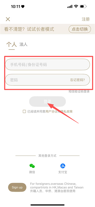 3、在登录页面,填写手机号码/身份证号和密码后,并点击登录完成登录。