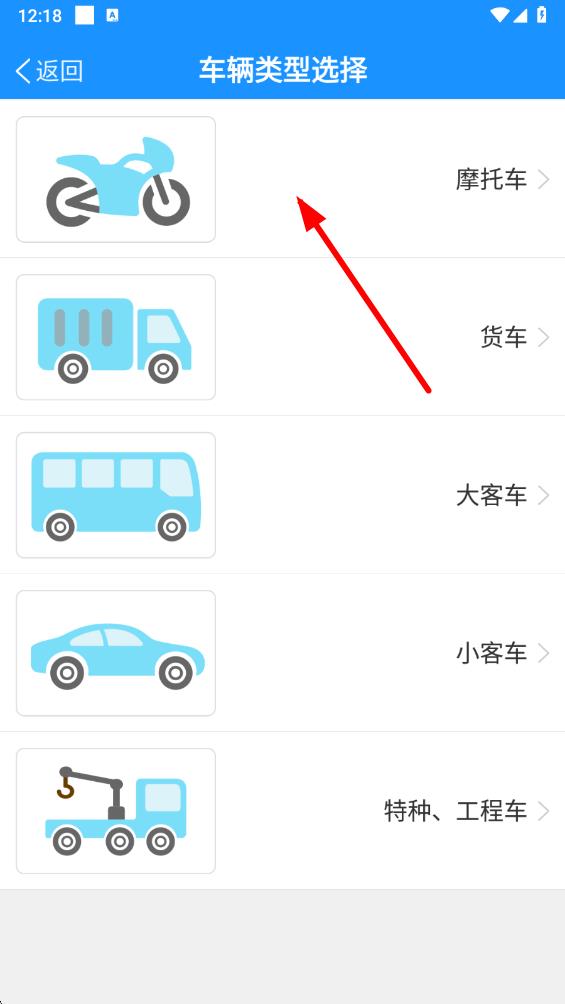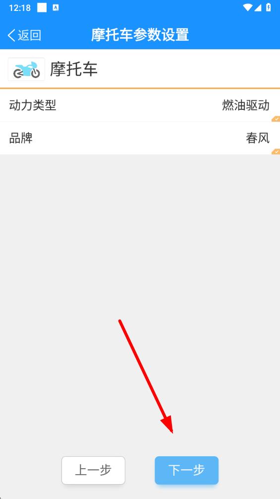 4、在车辆类型选择页面点击摩托车,进入摩托车参数设置界面。
