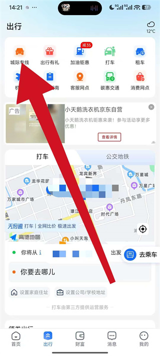 2、在出行页面中找到城际专线入口并点击,进入城际专线服务界面。