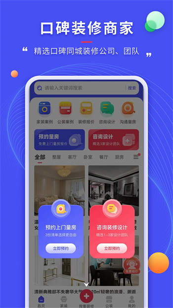 - 提供了千万套真实装修案例和实景美图,用户可以随时随地的在线查看各种案例,也可以更好的查找装修的灵感;