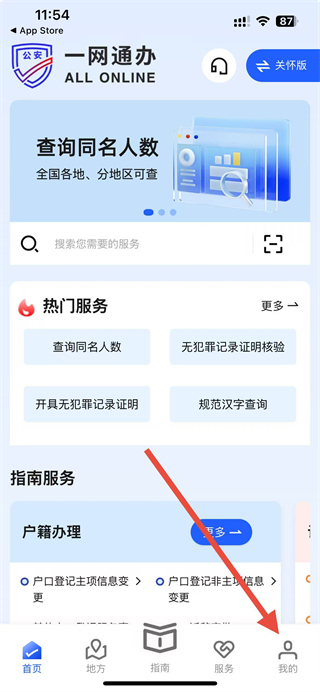 1、进入公安一网通办主界面后,点击底部我的选项,进入用户登录页面。