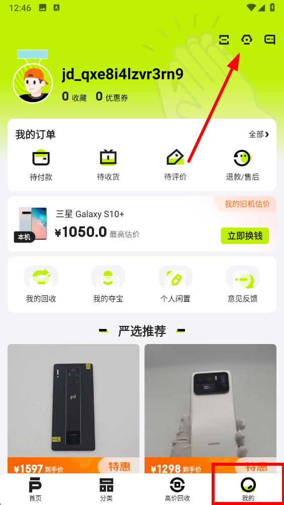 1、打开拍拍二手app,点击底部导航栏中的我的选项,点击页面右上角设置图标。