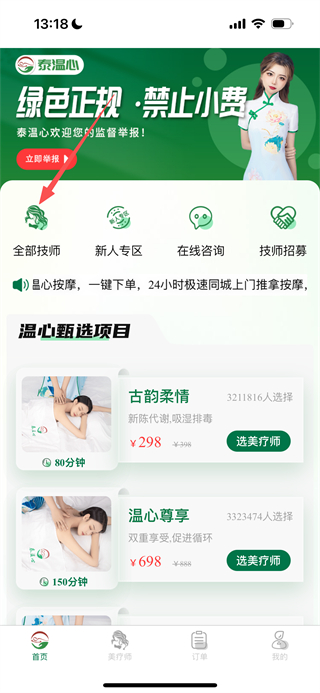 1、进入泰温心后,点击全部技师选项,可进入美疗师列表页面。