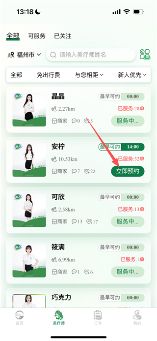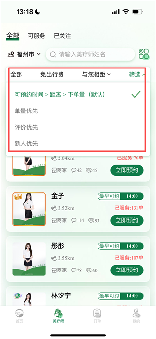 2、在美疗师页面,点击筛选按钮选择排序方式,可筛选出目标美疗师。