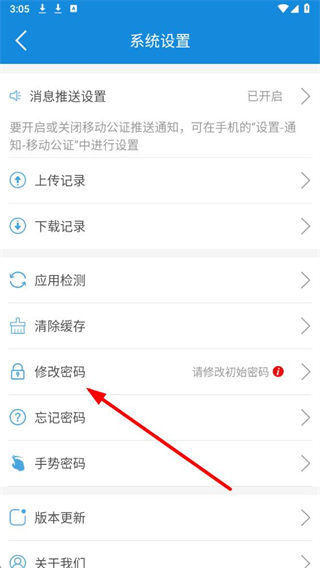 3、在系统设置页面,点击修改密码选项,进入密码修改的信息填写页面。