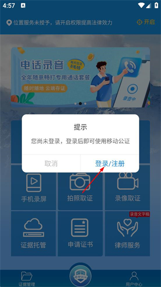 1、打开移动公证类APP,点击右下角“用户中心”,弹出提示后点击“登录/注册”。