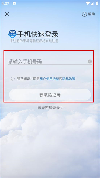 2、输入手机号码,勾选同意用户使用协议和隐私政策,点击“获取验证码”。
