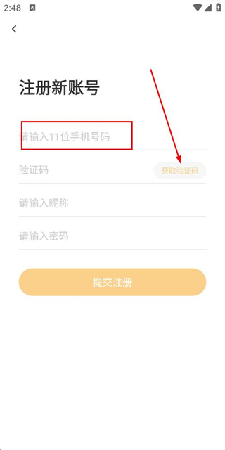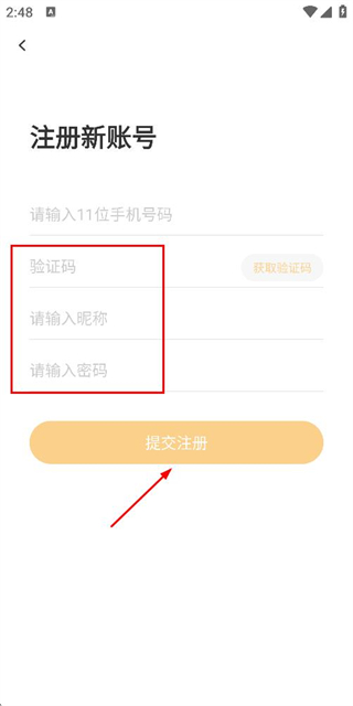 3、在注册账号页面填写验证码、昵称和密码后,点击提交注册完成注册操作。