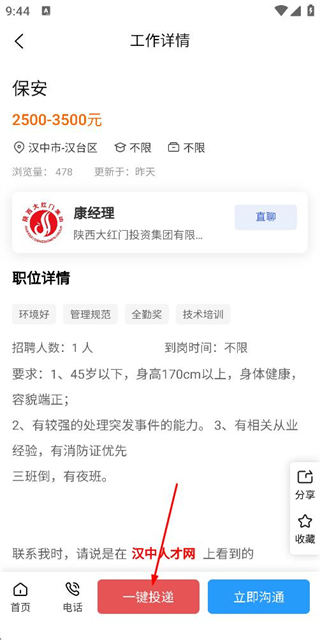 3、在工作详情页面确认信息后,点击一键投递按钮完成该职位的简历投递。