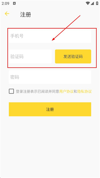 2、在注册页,填写手机号后,点击发送验证码并填写验证码。