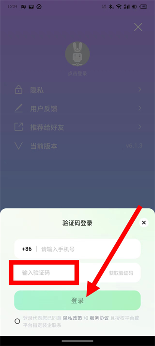 4、在输入框,输入验证码,勾选相关协议后,点击登录,完成登录。