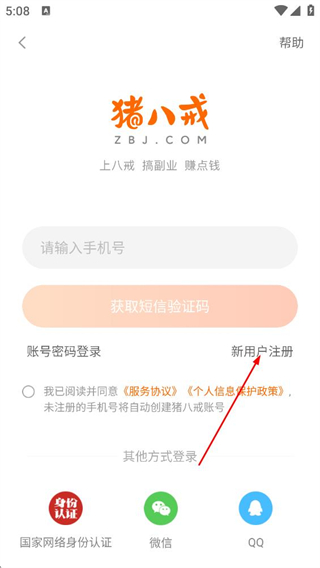 2、在猪八戒登录页,点击新用户注册选项,进入手机注册页面。
