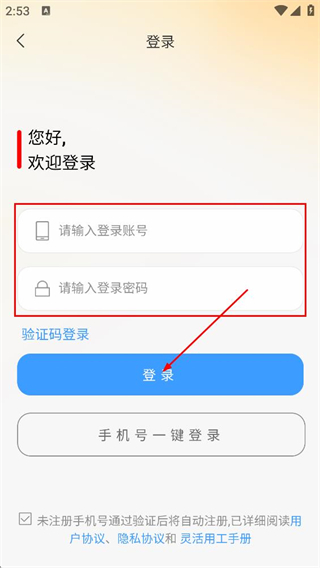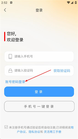 2、在登录页,点击账号密码登录选项,可切换登录方式。