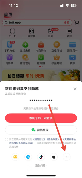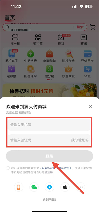 1、进入翼支付app,点击页面底部的登录注册按钮,触发登录相关的操作弹窗。