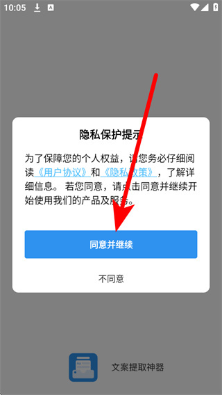 1、打开文案提取器,在弹窗中点击同意并继续,进入主界面。