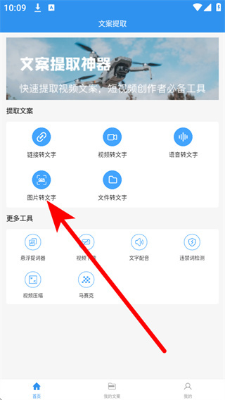 2、在主界面的提取文字板块中,点击图片转文字,进入图片提取文案的操作页面。
