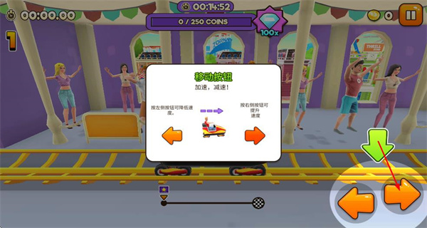 2、依据游戏内提示,操作移动按钮,控制过山车加速或减速,推进游戏进度。