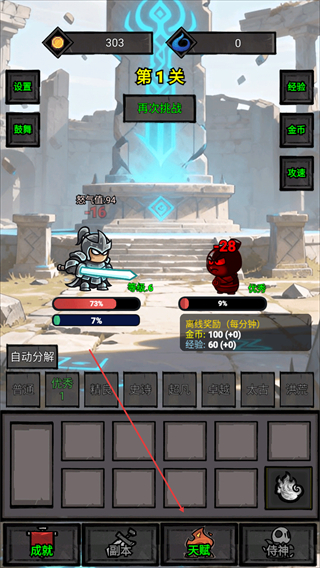 1、在第1关中操控角色攻击敌方,造成伤害积累经验与金币,推进战斗进程。