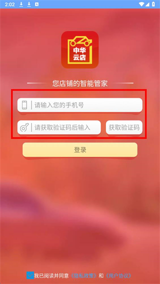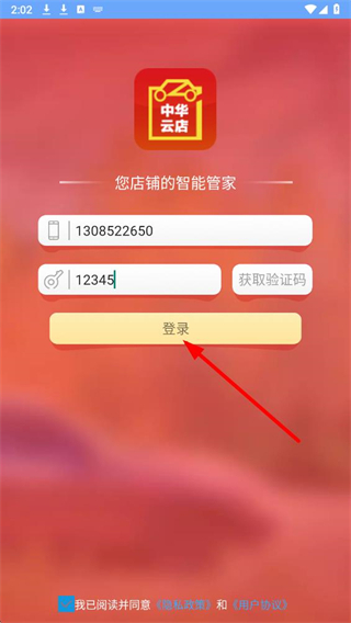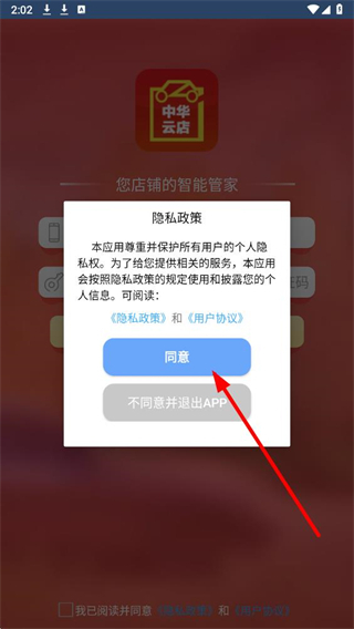 1、打开中华云店应用后,弹出隐私政策相关弹窗,点击同意按钮,即可继续后续操作。