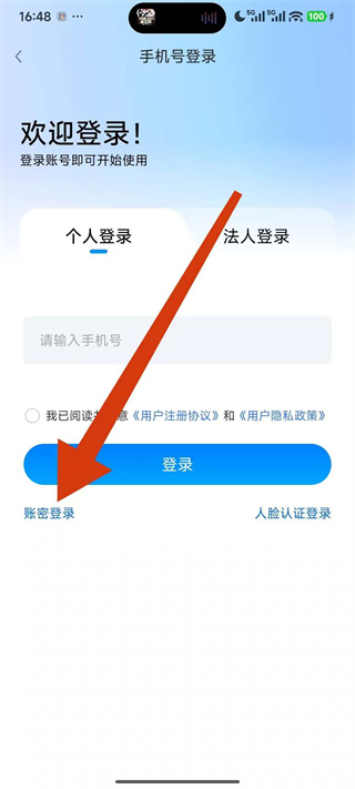 4、在账密登录页面填写账号密码,勾选相关协议后,点击登录完成账号密码登录。
