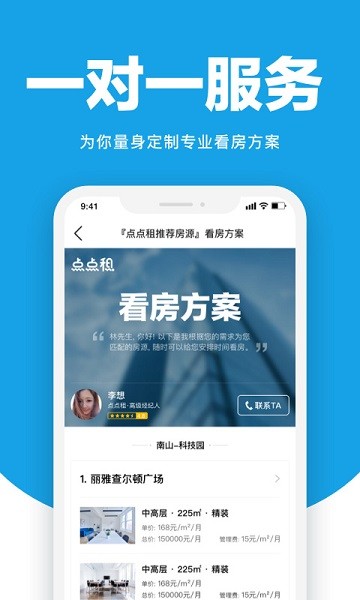 点点租对用户全程不收取任何中介费和服务费,节约用户租办公室成本。经纪人1对1帮客户匹配房源,带用户看房,用户在点点租经纪人的帮助下完成向业主议价、签约、验收及后续流程。让客户安心放心更省心。