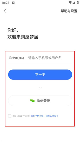 2、在登录页面,填写手机号或选择微信登录,勾选协议后进入下一步。
