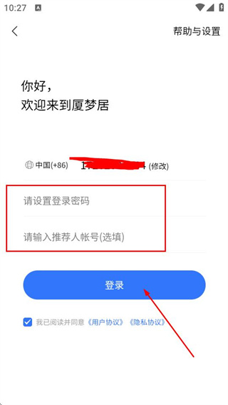 3、在后续页面,设置密码并填写推荐人账号后,点击登录按钮即可完成账号登录。