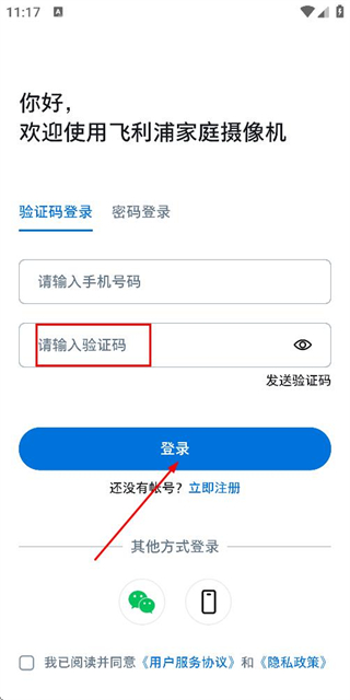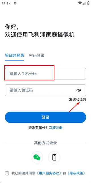 2、在登录页面填写手机号,勾选协议后,点击发送验证码。