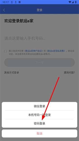 1、在航运e家登录页面,点击其他方式登录选项,弹出登录方式选择弹窗。