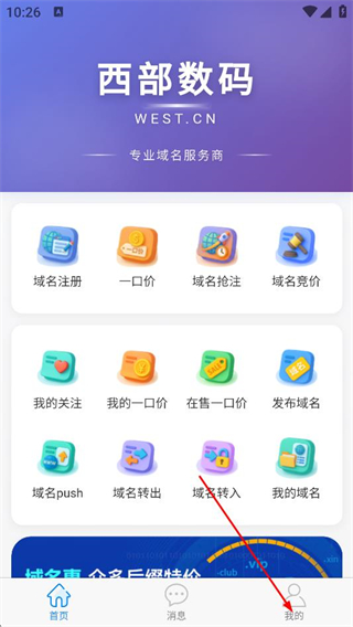 1、在西部数码首页,点击底部我的,进入个人相关页面。