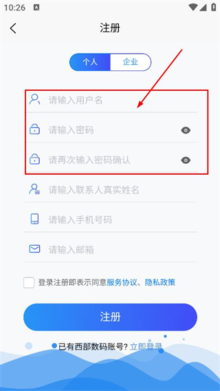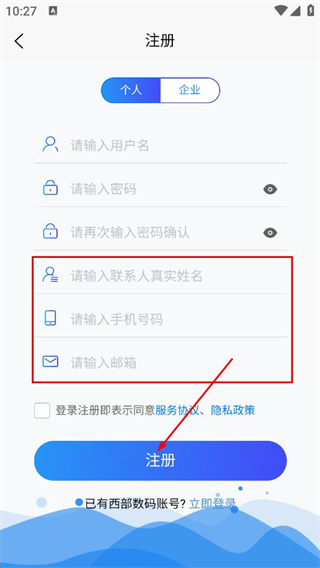 4、在注册页面,填写真实姓名、手机号码、邮箱后,点击注册按钮完成注册。