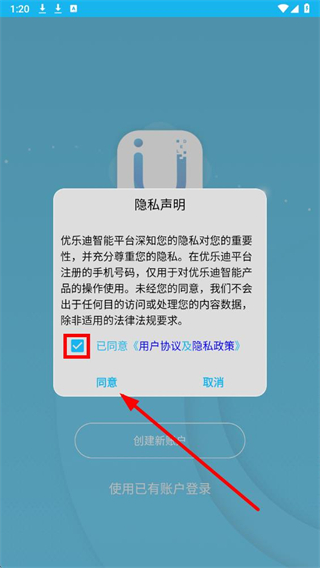 1、进入优乐迪app,在启动页点击创建新账户按钮,进入账号注册的流程页面。
